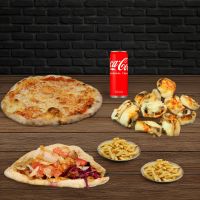 Für alle Pizza-Fans, die nicht genug bekommen können! Freut euch auf 2x Pizzabrötchen nach Wahl, 1x große Pizza nach Wahl, 2 kleine Pommes inkl. 3 Getränke eurer Wahl!