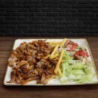 Jeweils mit selbstgebackenem Fladenbrot, frischem Salat, Gemüse vom Grill und deiner Wahl aus Reis oder Pommes Frites – plus zwei hausgemachten Dips