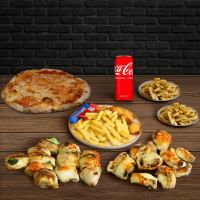 Für alle Pizza-Fans, die nicht genug bekommen können! Freut euch auf 2x Pizzabrötchen nach Wahl, 1x große Pizza nach Wahl, 2 kleine Pommes inkl. 3 Getränke eurer Wahl!